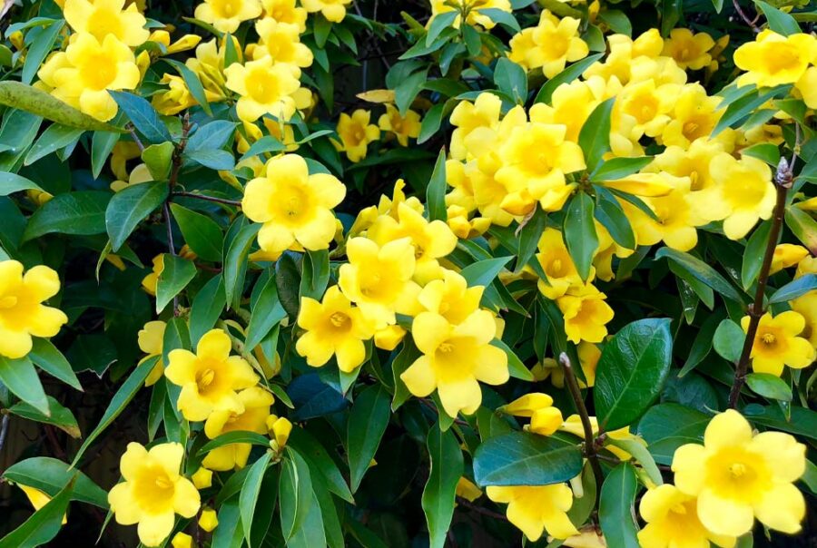 These little vining plants are known as yellow jessamine. Yellow jessamine pronounced yellow jes-uh-min is a native southern species which is usually one of the first to bloom. It is also referred to as Carolina jessamine or poor man’s rope. It can be found from Virginia to Florida and as far west as Texas.